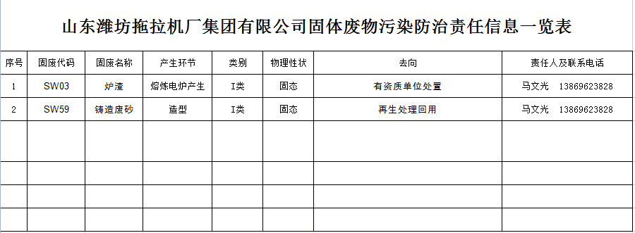 山東濰坊拖拉機廠集團有限公司危險廢物污染防治責任信息一覽表